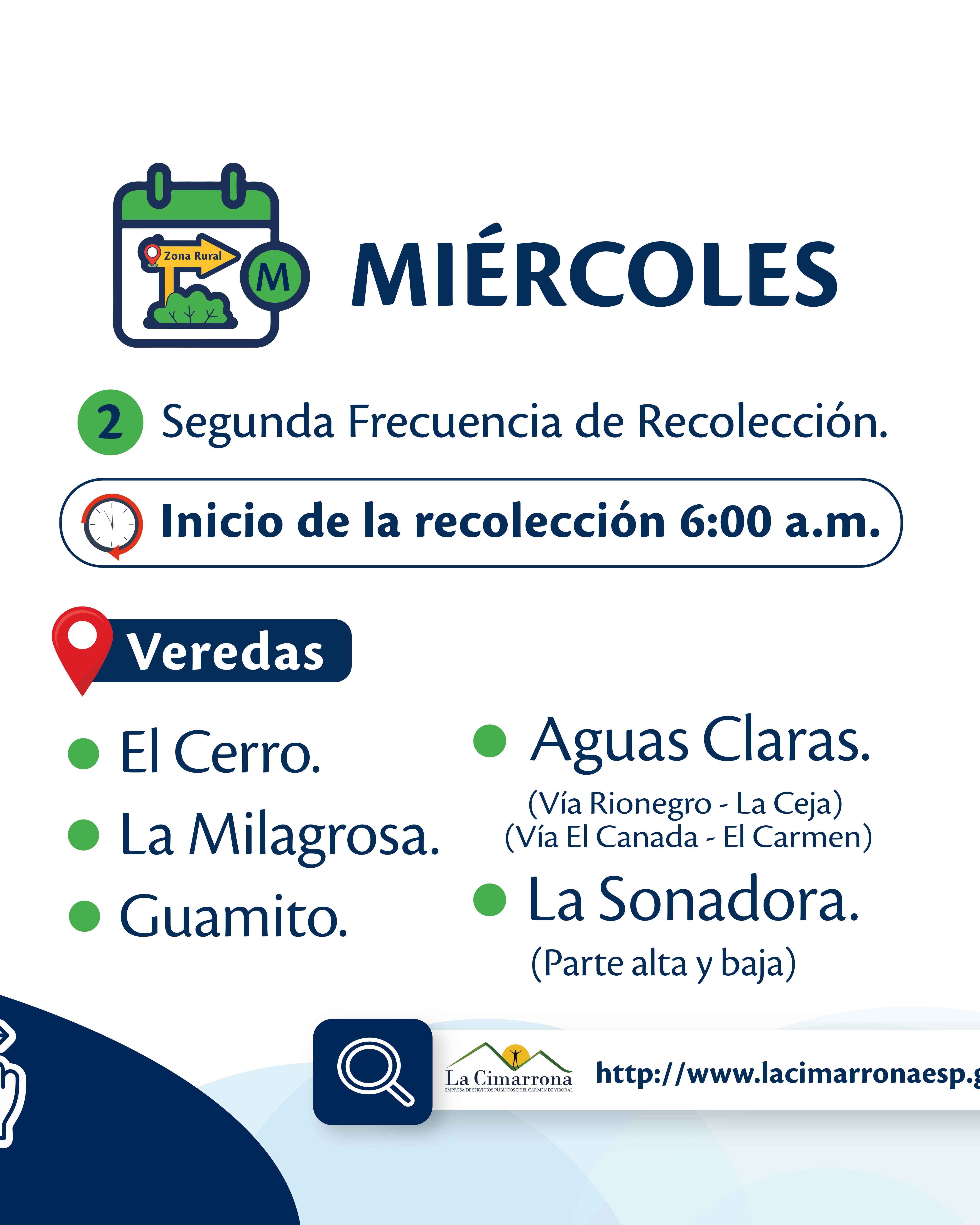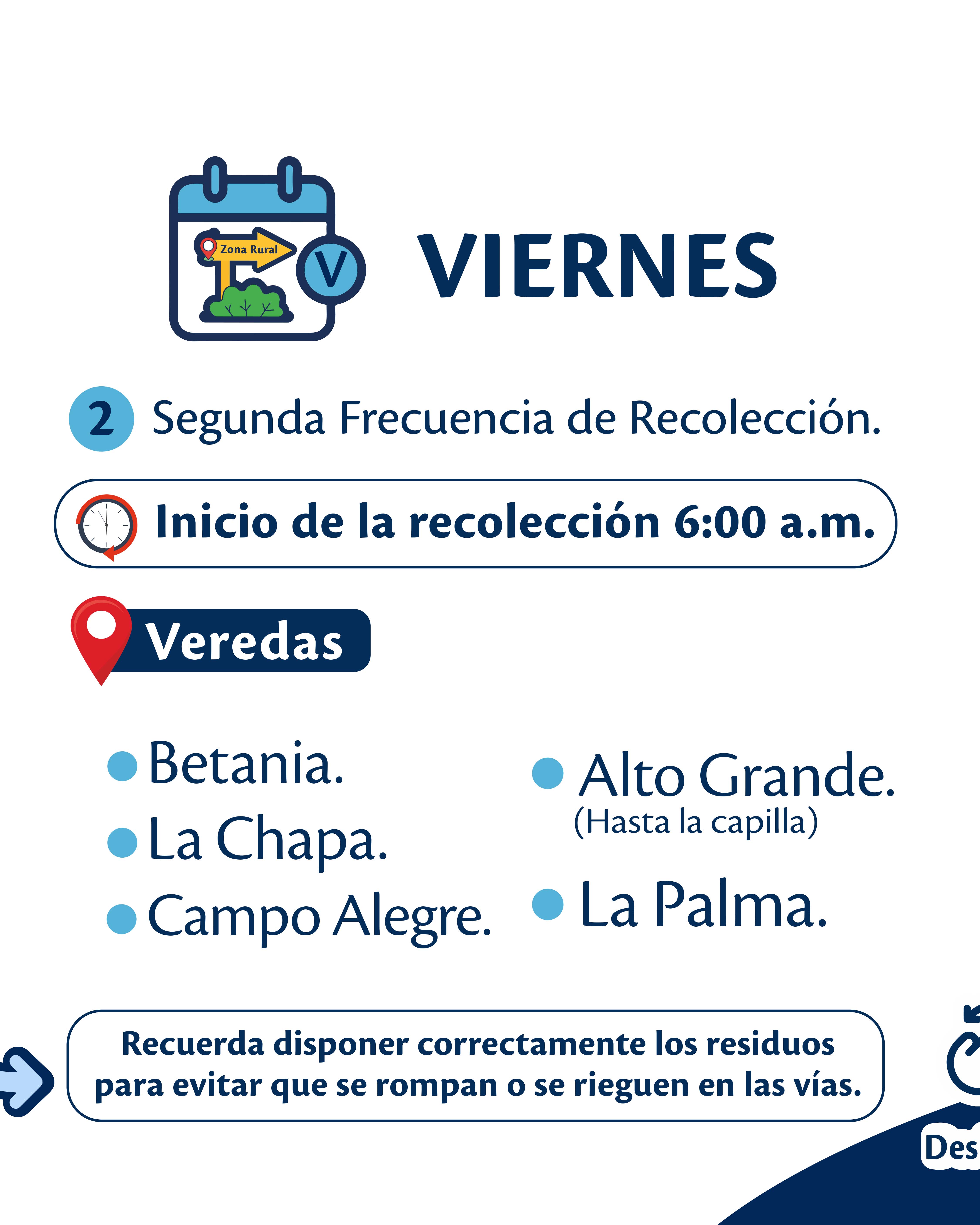 En el sector rural, la recolección de residuos se realiza en jornada diurna, iniciando a partir de las 6:00 a.m., bajo un esquema de dos frecuencias semanales que permiten optimizar la operación y mantener el territorio limpio y ordenado. Es importante recordar que los martes no se presta el servicio de recolección.
