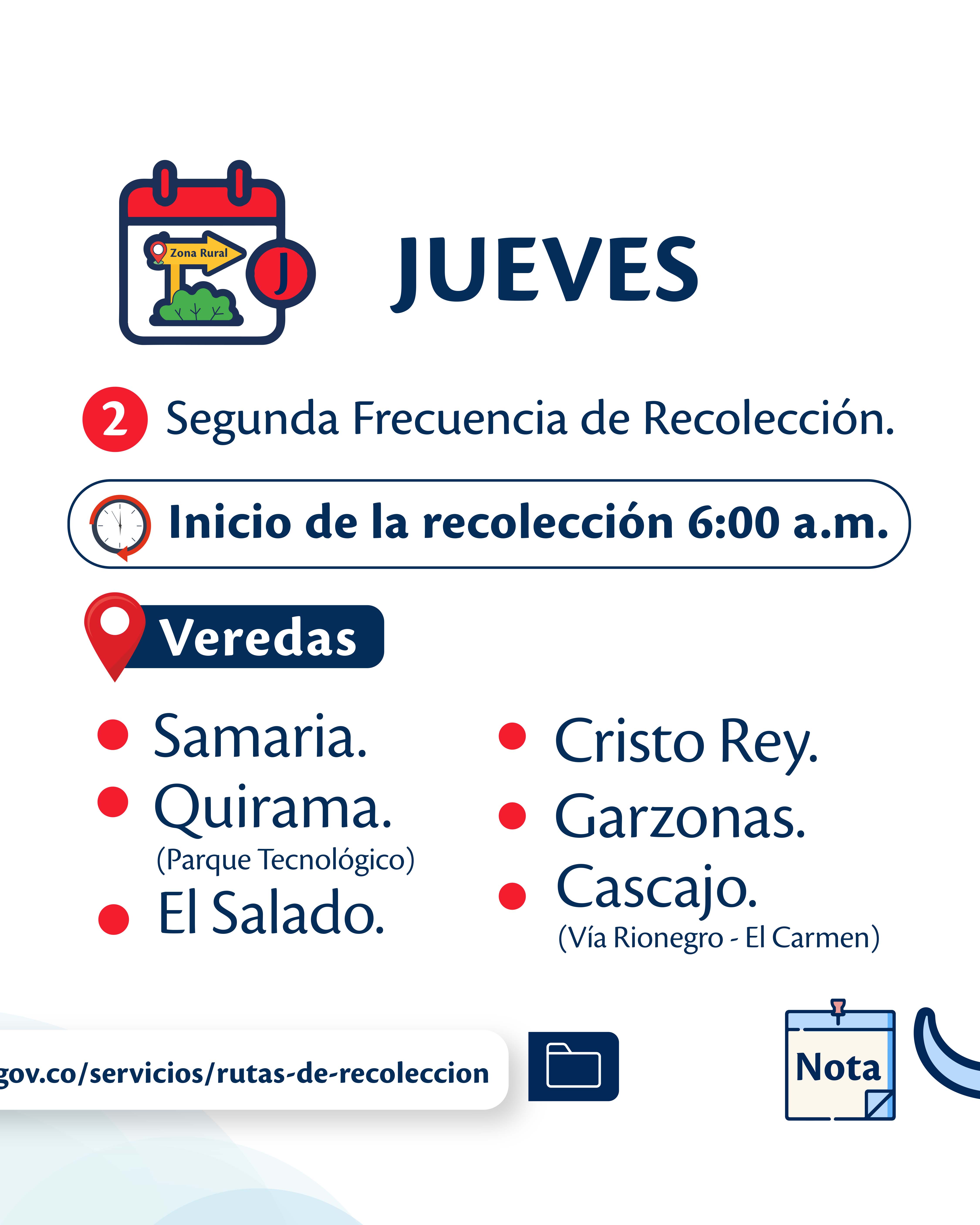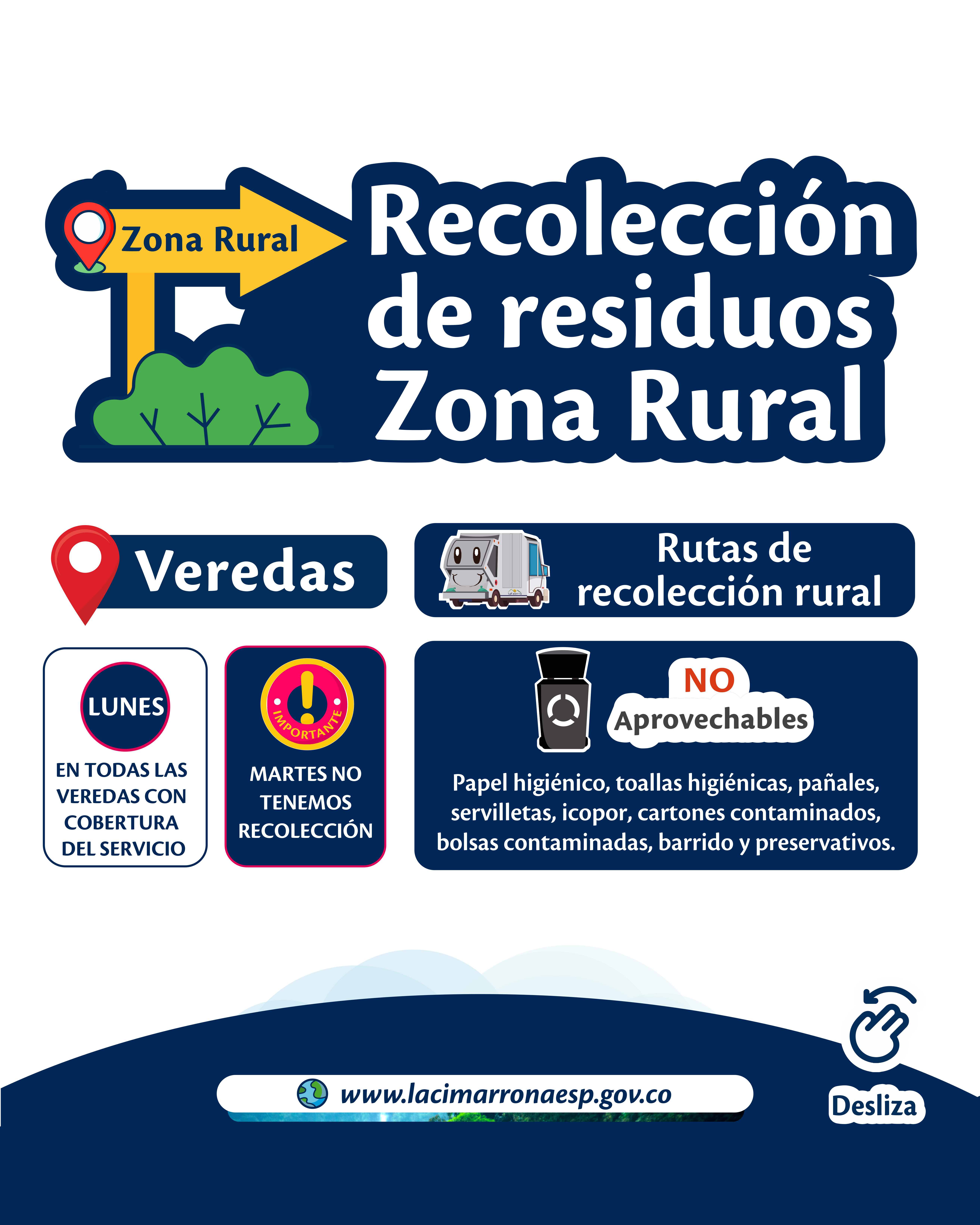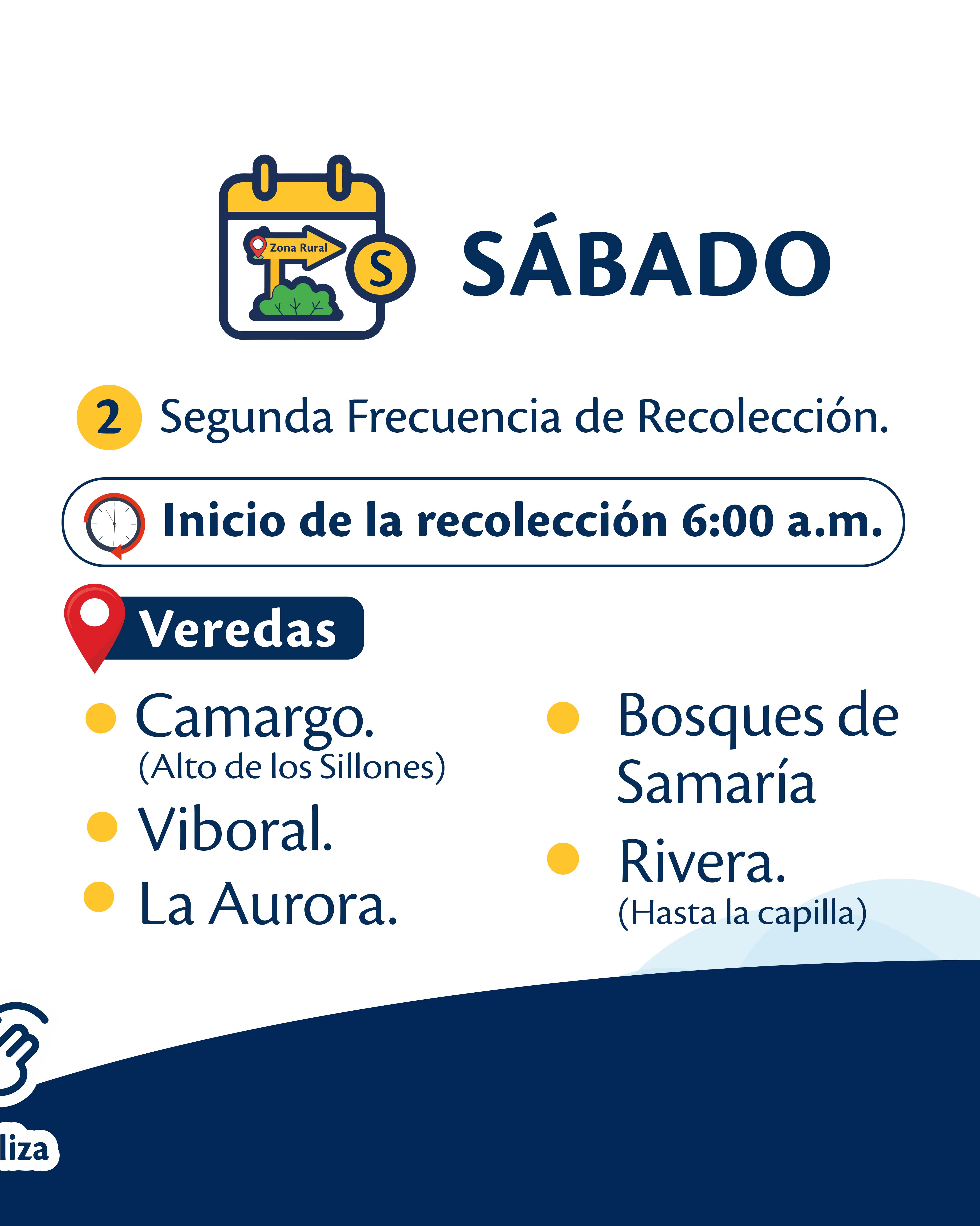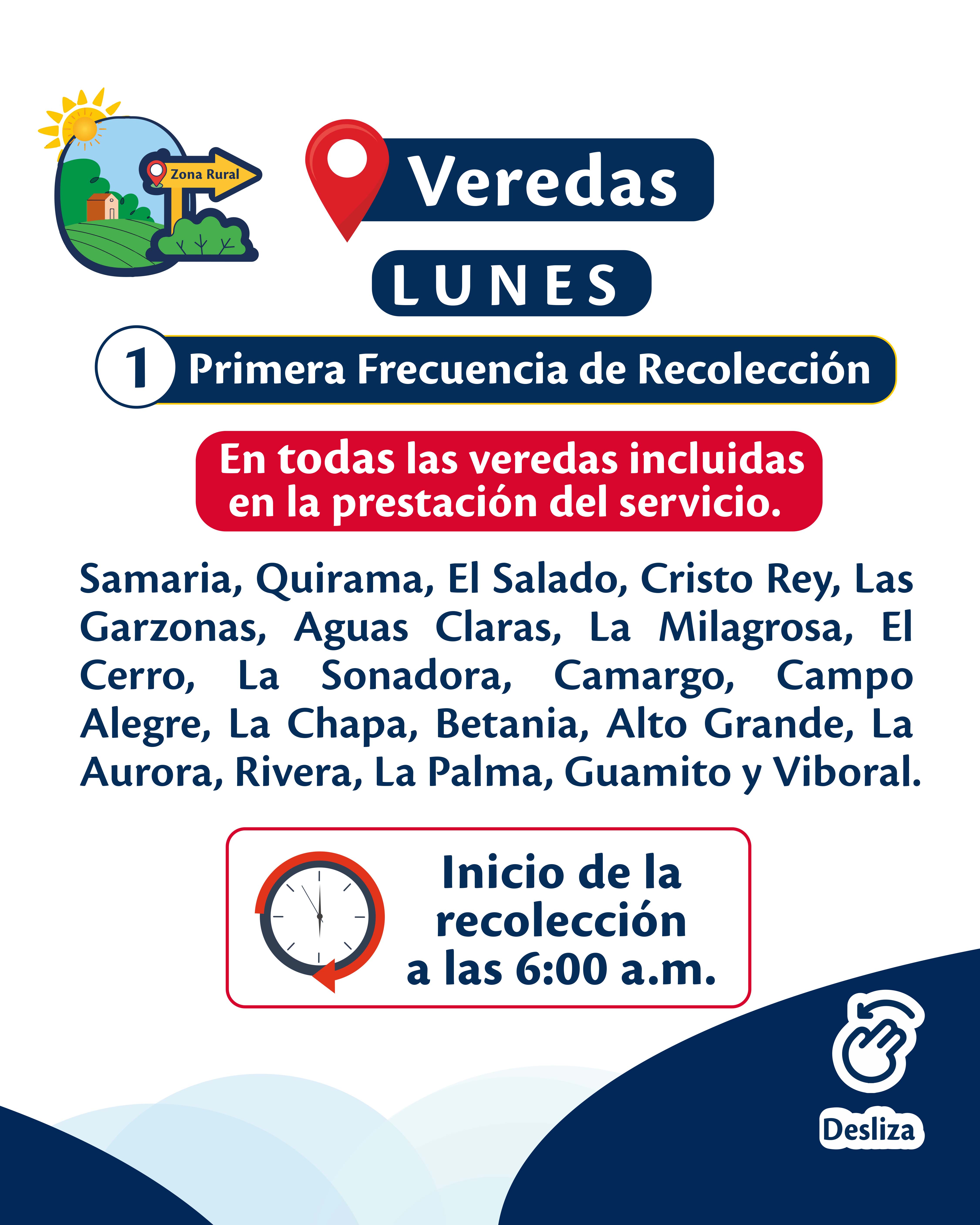 En el sector rural, la recolección de residuos se realiza en jornada diurna, iniciando a partir de las 6:00 a.m., bajo un esquema de dos frecuencias semanales que permiten optimizar la operación y mantener el territorio limpio y ordenado. Es importante recordar que los martes no se presta el servicio de recolección.