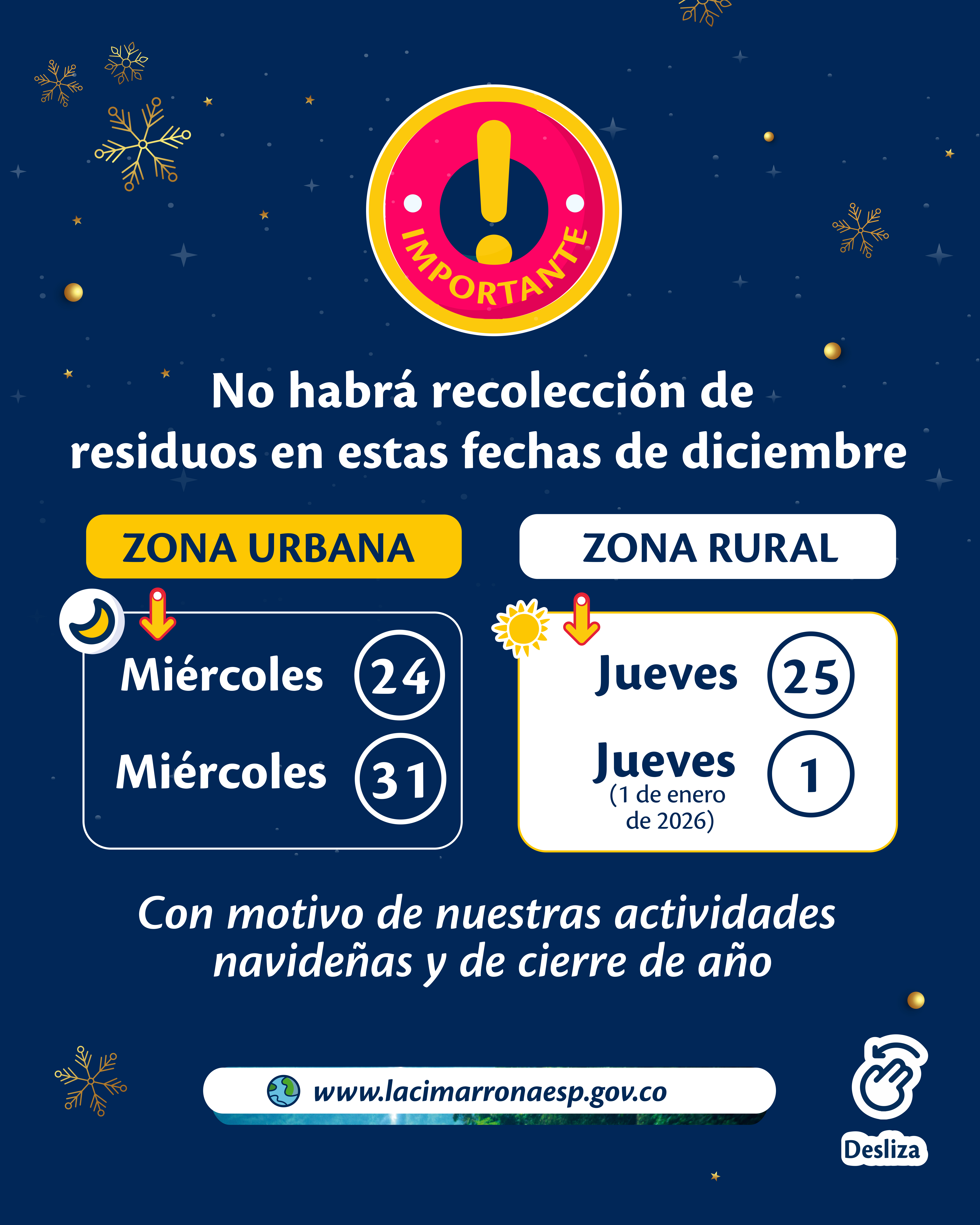 Con motivo de las festividades navideñas y de cierre de año, La Cimarrona E.S.P. informa a la comunidad carmelitana que no se prestará el servicio de recolección de residuos en las siguientes fechas: