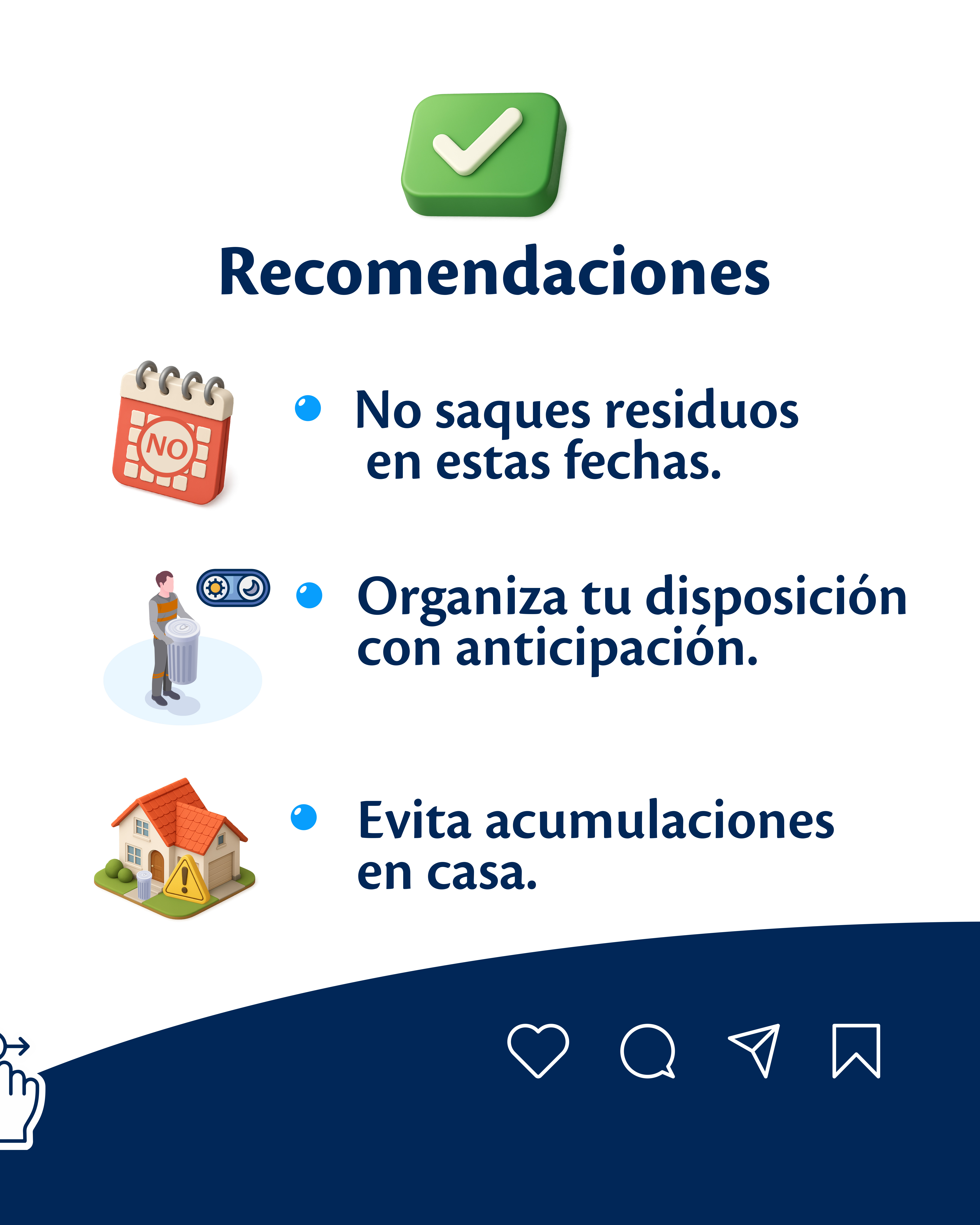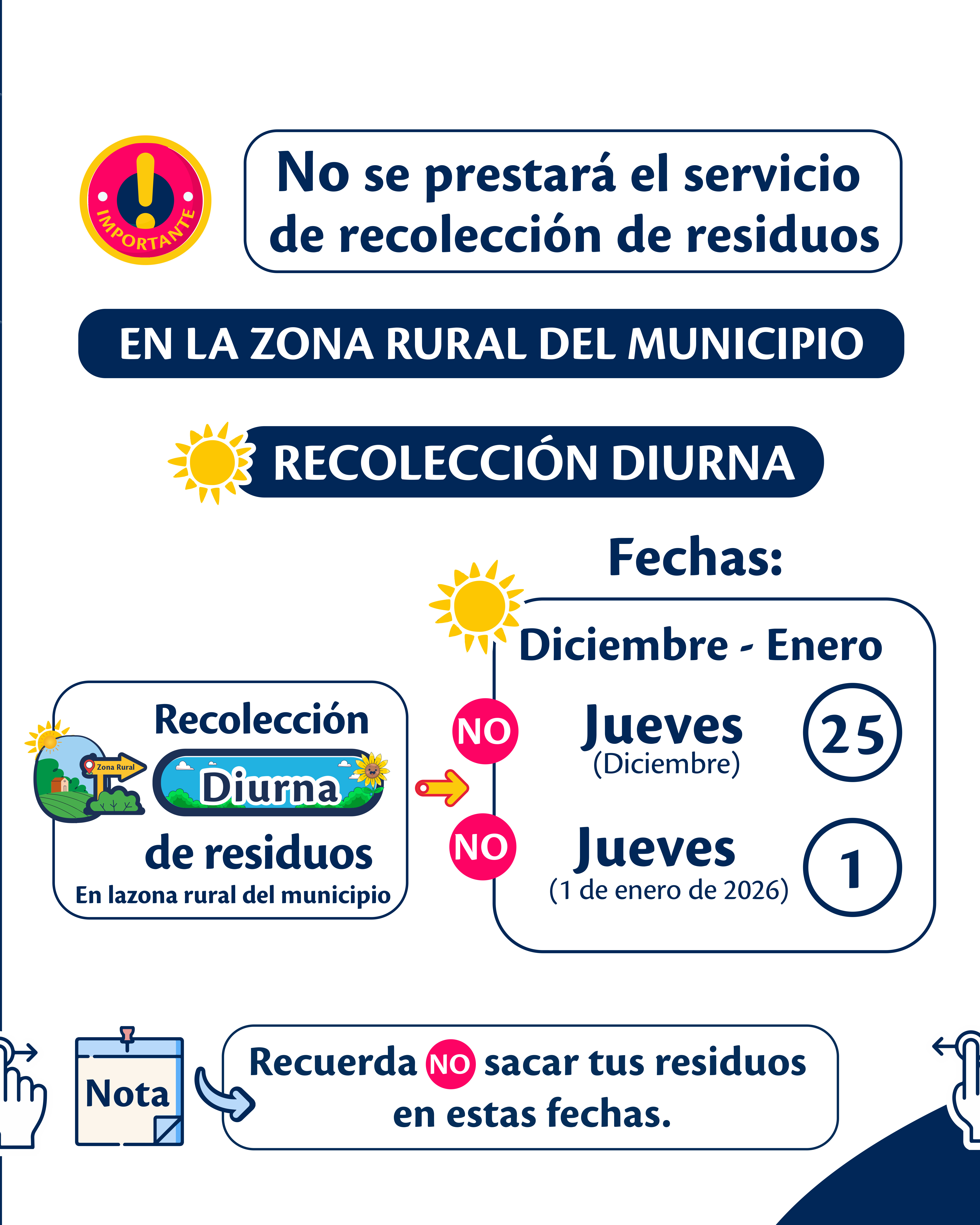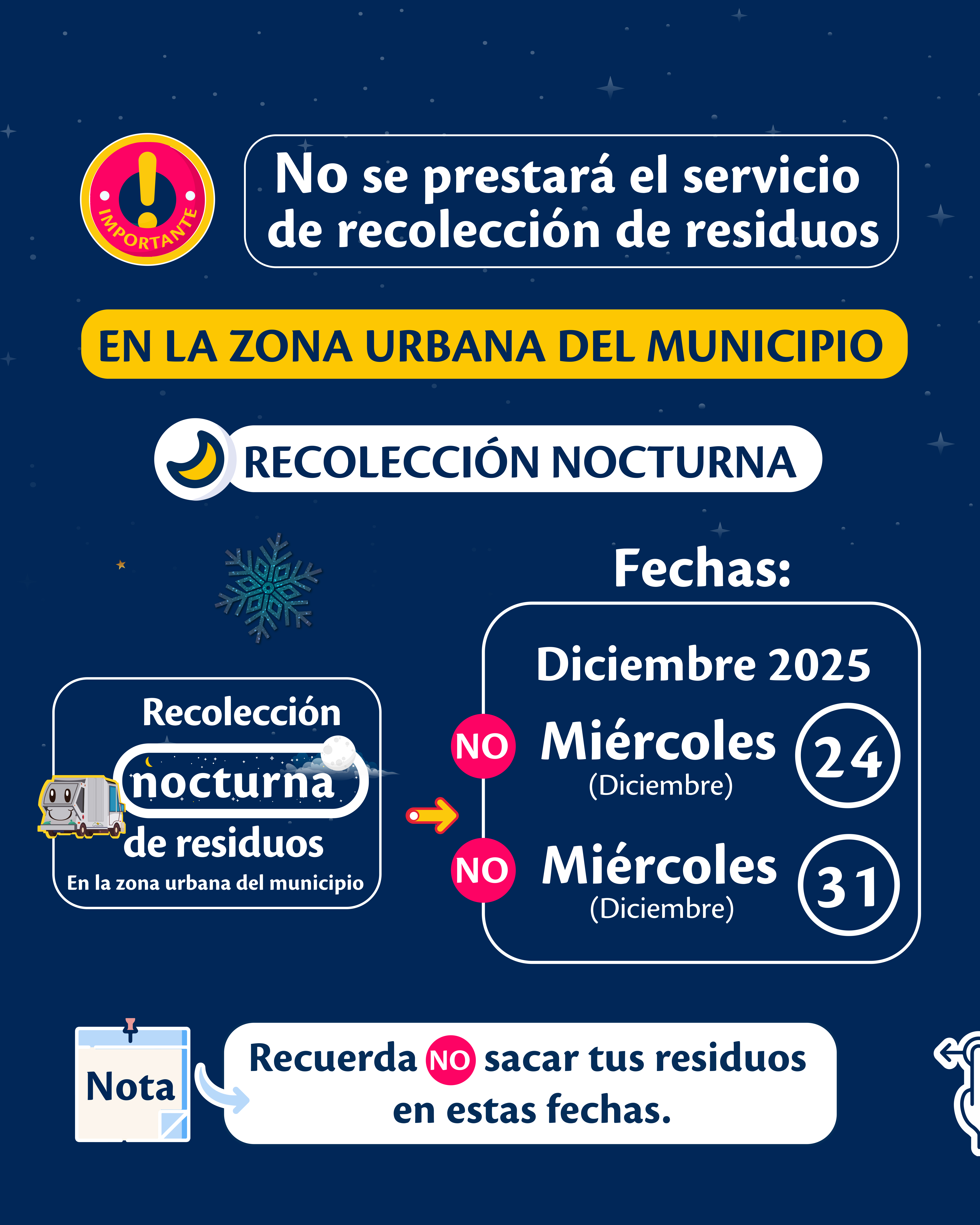 La empresa recomienda a todos los usuarios no sacar los residuos en las fechas indicadas, programar con anticipación su disposición y aprovechar los días previos de recolección, con el fin de evitar acumulaciones y afectaciones al entorno.